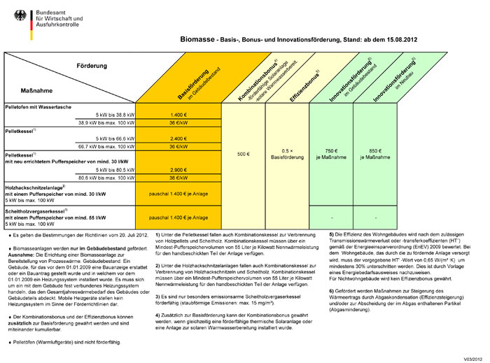 Ab dem 15. August 2012 sind die Zuschüsse für Solaranlagen (thermisch), Biomasseanlagen und Wärmepumpen in 1- und 2-Familienhäusern, in Mehrfamilienhäusern sowie in gewerblichen und öffentlichen Gebäuden deutlich erhöht worden.